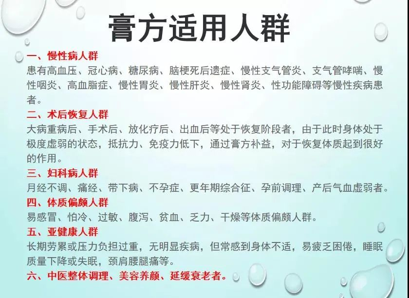 冬季膏方,又名膏滋,是在复方汤剂的基础上,经浓煎后掺入胶类及其他辅料而制成的一种稠厚状半流质或冻状剂型,主要是调理体质,治疗疾病,标本兼治,治本为主,可以达到有病可治,无病强身,延年益寿的目的。